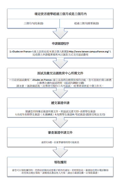 所有到法國進修的學生,只要停留超過三個月,就必須先透過法國教育中心的 «Etudes en France» 線上系統完成註冊,以及面試審核,再進行簽證申請的程序 。